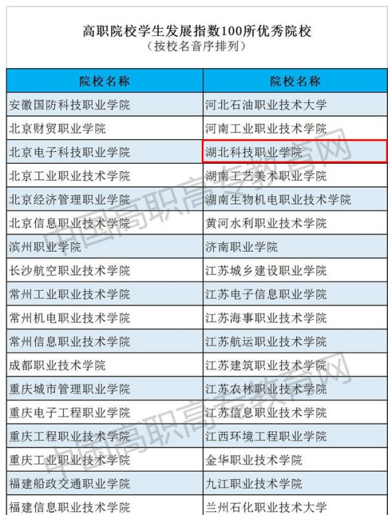 近日,由中國教育科學研究院、全國職業高等院校校長聯席會議編制的《2022中國職業教育質量年度報告》(以下簡稱“報告”)已由高等教育出版社出版。報告分為高等職業教育篇和中等職業教育篇,高等職業教育篇從服務貢獻、學生發展、教育教學、政府責任和國際合作五個質量維度,向社會展示中國高等職業教育2021—2022學年的發展面貌。報告遴選出高職院校學生發展指數100所優秀院校,湖北科技職業學院成功入選。