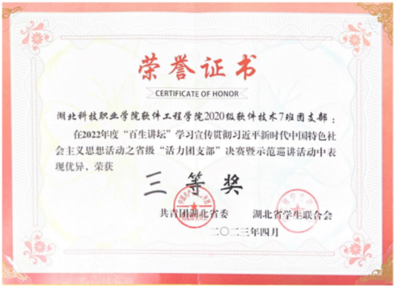 4月2日下午,由共青團湖北省委員會、湖北省學生聯合會主辦的2022年度“百生講壇”學習宣傳貫徹習近平新時代中國特色社會主義思想活動之省級“活力團支部”決賽暨示范巡講活動在湖北大學舉行。湖北科技職業學院軟件工程學院2020級軟件技術7班團支部經過多輪遴選角逐,在全省報名參賽的117所高校414個團支部中脫穎而出,成功晉級決賽前六并榮獲三等獎,與武漢大學、華中農業大學、武漢理工大學等5所高校同臺示范展演,進一步彰顯了湖北科技職業學院學子奮進風采和“三全”育人成效,提升了學校美譽度和影響力。