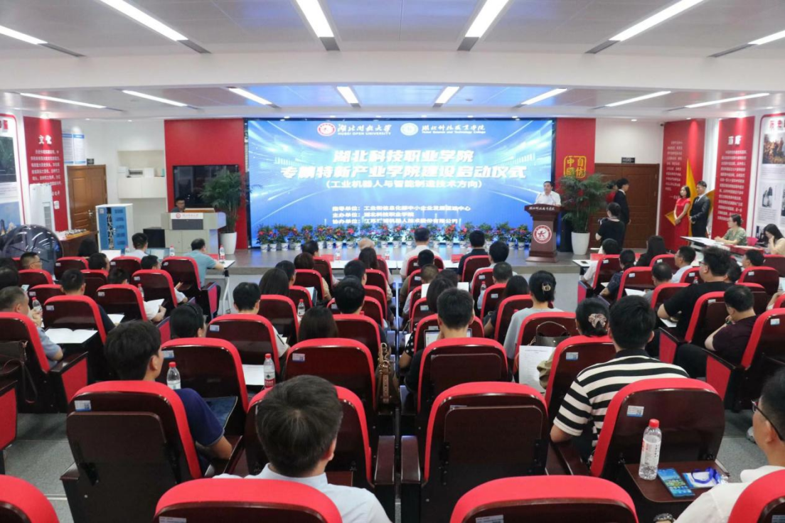 7月13日,驕陽似火,激情四溢,湖北科技職業學院舉行工業機器人及智能制造技術專精特新產業學院建設啟動儀式。湖北科技職業學院黨委書記劉義,教育部職成司原副司長、中國職業教育學會原常務副會長兼秘書長劉占山,工業和信息化部中小企業發展促進中心人力資源研究所副所長陳琛,湖北省經濟和信息化廳中小企業發展處處長劉衛軍,湖北省教育廳二級巡視員何澤云,清華大學國家服務外包人力資源研究院副院長毛居華,中國職工技術協會職工新技能培訓專委會副秘書長張冉冉,高校畢業生就業協會機器人專委會常務副秘書長黃偉,工業和信息化部中小企業發展促進中心人力資源研究所張瀟陽出席了啟動儀式。會議由副校長宋移安主持。