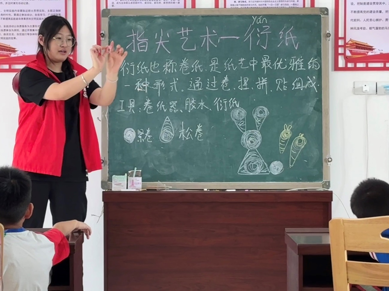 (頭雁實(shí)踐隊(duì)隊(duì)長肖雨欣教小朋友制作衍紙手工)