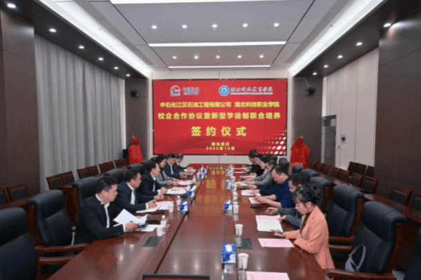 為深化產教融合、推進校企協同育人,湖北科技職業學院與中石化江漢石油工程有限公司于10月17日上午在該校8104會議室舉行校企合作協議暨新型學徒制聯合培養簽約儀式。中石化江漢石油工程有限公司黨委副書記陳常山、中國石化集團公司黨組組織部高級主管黨玉涵及中石化江漢石油工程有限公司黨委組織部部長韓家新等一行六人,湖北科技職業學院黨委常委、紀委書記、監察專員丁華濤,教務處、校企合作處領導,機電工程學院班子成員和教師代表參加儀式。