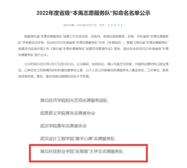 本網訊(通訊員 肖莉山 文/圖)3月7日,團省委公布了2022年度省級“本禹志愿服務隊”名單,我校傳媒藝術學院“區微里”大學生志愿服務隊成功入選,這是我校首次獲批省級“本禹志愿服務隊”團隊,是開展社會實踐工作的又一次新的突破。