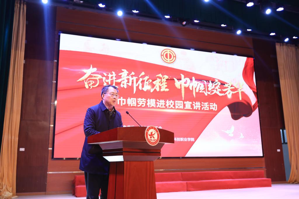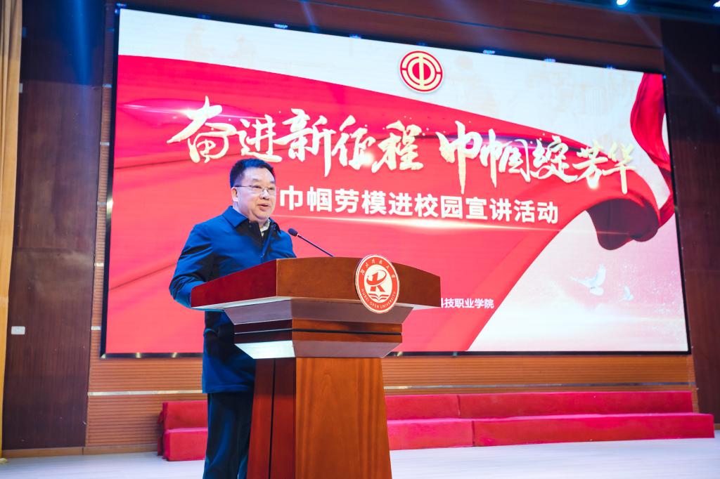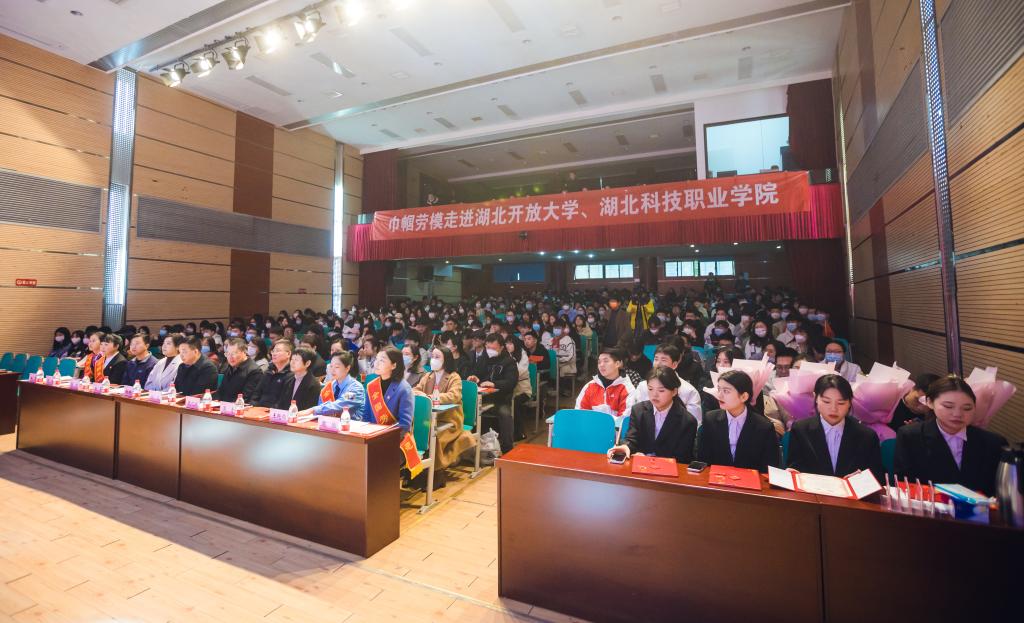 本網(wǎng)訊(通訊員 沈雁君/文 劉捷 李賀剛/圖)神州自古贊巾幗,美譽娥眉響頌歌。3月21日,以“奮進新征程 巾幗綻芳華”為主題的巾幗勞模進校園宣講活動在湖北科技職業(yè)學(xué)院舉行。湖北科技職業(yè)學(xué)院黨委書記劉義、黨委常委張化斌,省總工會黨組成員、副主席劉建宇等出席活動并分別致辭?;顒友埩巳珖逡粍趧营?wù)芦@得者王艷鴿,黨的二十大代表、全國勞動模范周怡,黨的二十大代表、全國勞動模范姚婕,全國五一巾幗標(biāo)兵、全國“城鄉(xiāng)社區(qū)抗疫巾幗先鋒” 倪娟四位巾幗勞模走進校園,以“文藝+宣講”的形式,為當(dāng)代大學(xué)生上了一節(jié)別開生面的“大思政課”。
