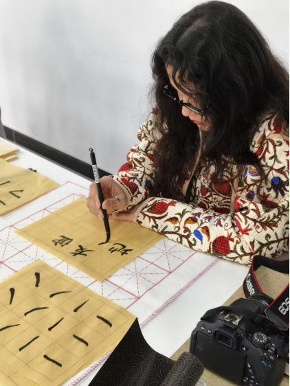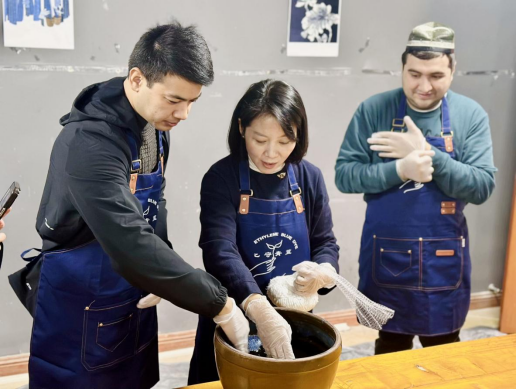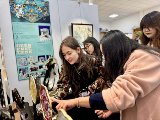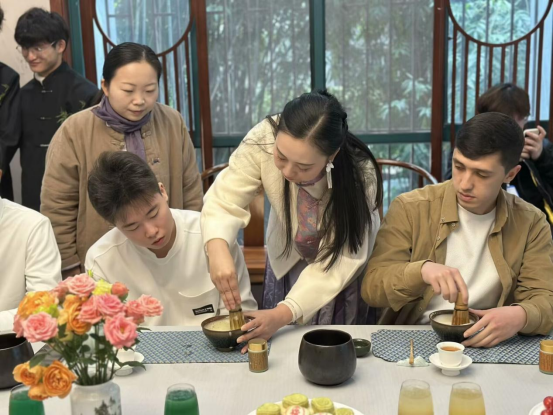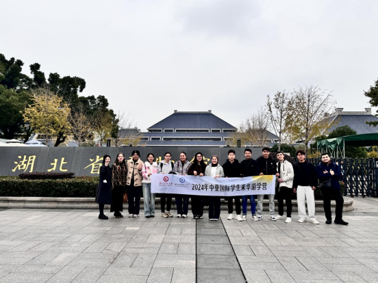 在藝術創意學院,國際學生觀看了畢業設計作品展,親身體驗了漆扇制作和藍染技藝。漆液留駐在扇面上形成圖畫的妙趣天成以及植物藍靛“布里生花”的渾然天成,將中國傳統文化的瑰麗精致展現得淋漓盡致。他們展示著自己親手制作的作品,紛紛贊嘆稱奇,表示對荊楚傳統文化有了更深刻的感悟。在工商管理學院,大家感受了宋代風雅“四藝”即焚香、點茶、掛畫、插花的視聽盛宴,親自動手進行了仿宋點茶實操以及香丸制作,沉浸式感受了中國傳統文化的獨特韻味。他們表示,這些精妙的傳統藝術深深震撼了他們,這些古老技藝不僅是中國文化的瑰寶,更是全人類共享的精神財富。在經濟貿易學院,師生共同體驗了書法之美,筆墨紙硯一一排開,領略漢字筆畫間的深邃韻味,在老師的指導下,國家學生們與我校學生用毛筆共同書寫了“友誼地久天長”的美好愿望。在校外實踐教育基地湖北省博物館,同學們與文物對話,觸摸荊楚故事,探尋了荊楚大地悠久歷史與燦爛文化的精髓。