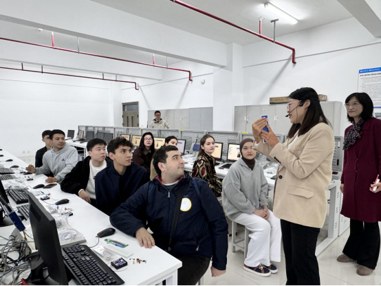 在人工智能學院,國際學生參觀了鯤鵬產業學院文化長廊,了解人工智能技術的強大魅力和廣泛應用前景,大家積極提問,并紛紛駐足拍照留念,現場氣氛熱烈。在軟件工程學院,他們體驗了“智能樓道燈”的模擬小制作,在老師的指導下親手將電子元件插入面板,成功制作了光控開關,無不感嘆科技創新的神奇與魅力。在機電工程學院,他們親自操作機器人,體驗逆向掃描、電工接線、工業機器人操控,參觀智能產線,感受石油鉆井采油技術。他們表示,這些體驗活動拓寬了他們的科技視野,感受到了在中國智能制造技術的廣泛應用和深遠影響。機電工程學院的老師和同學,還為國際學生展示了古琴和武術,為活動增添了一抹亮色。
