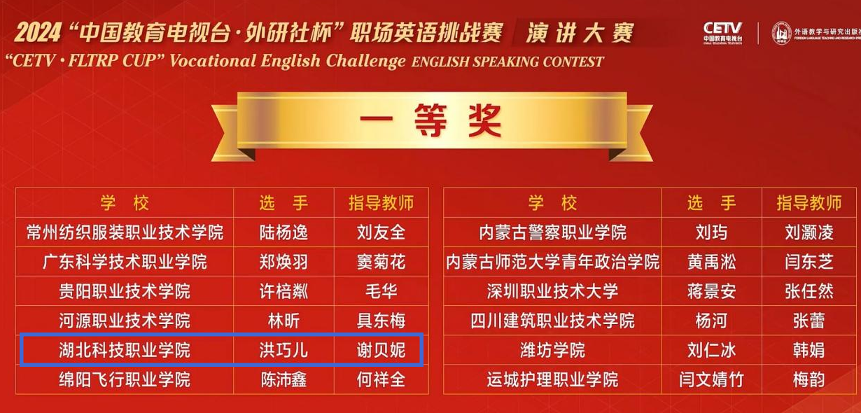 本次大賽從5月開始啟動,歷經校賽、省賽、全國網絡賽和全國總決賽的層層選拔。在過去的半年中,我校英語教學團隊不斷升級備賽模式,優化賽事指導方案,力求全方位提升學生的競爭力。洪巧兒在省賽中以總分第三的驕人成績代表湖北省出征全國決賽,陳安妮和楊秀丹以網絡賽場特等獎的優異成績晉級全國決賽。我校首次獲得本項賽事的國賽資格,并一舉獲取3名全國決賽晉級名額,在全國兄弟院校實為罕見,不僅創下了湖北省參賽院校單次晉級國賽的最高紀錄,也成為與深圳職業技術大學、浙江交通職業技術學院并居全國決賽名額之首的三所院校,為學校在全國范圍內贏得了廣泛關注和高度美譽。