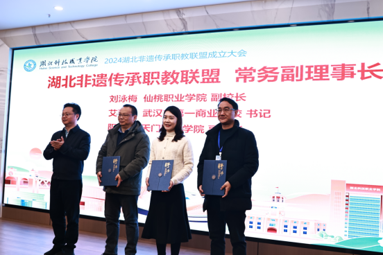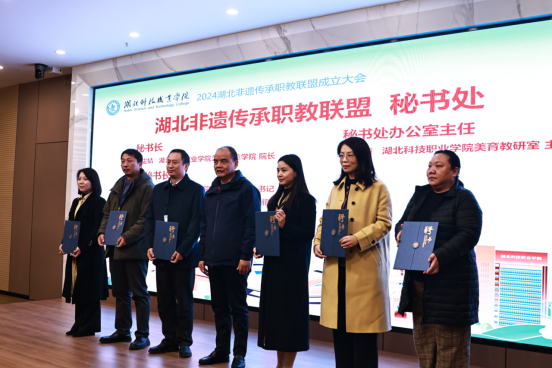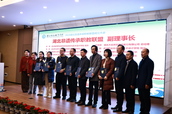 大會審議通過了《湖北非遺傳承職教聯(lián)盟章程(草案)》及第一屆組織機構候選人名單,并為理事長、常務理事長、副理事長等頒發(fā)聘書。