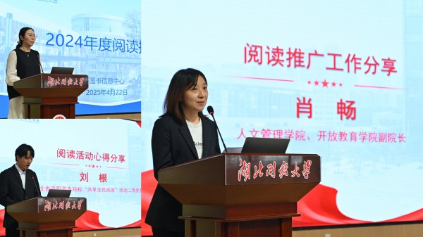在閱讀分享環(huán)節(jié),人文管理學(xué)院、開放教育學(xué)院副院長(zhǎng)肖暢以終身學(xué)習(xí)讀書社為例,分享了學(xué)院在成人繼續(xù)教育領(lǐng)域的閱讀推廣工作。第九屆湖北省高職高專院校“共享全民閱讀”活動(dòng)二等獎(jiǎng)獲獎(jiǎng)?wù)摺C(jī)電工程學(xué)院劉根同學(xué)分享了比賽心得與閱讀感悟。