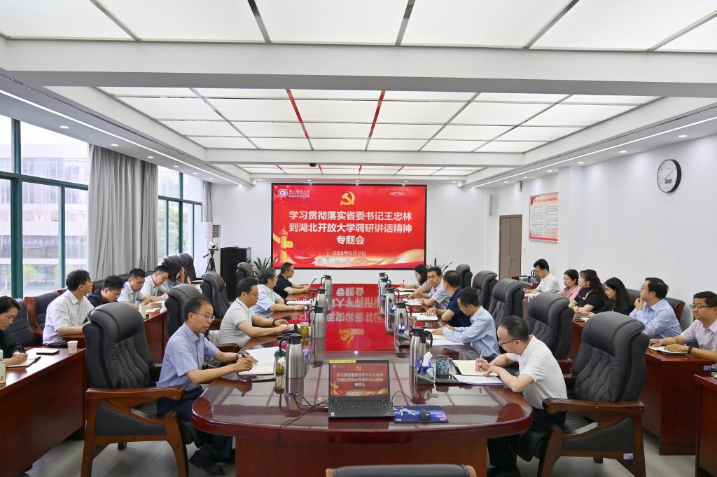 鐘毓寧作總結講話,他指出,省委書記王忠林到湖北開放大學調研對學校發展具有重要意義:一是明確了學校的發展定位與方向。王忠林書記指出開放大學要堅持“以開放理念辦好開放大學”,在服務全民終身學習和學習型社會建設中發揮更大作用,為學校未來發展指明了方向。二是推動了資源整合與優化。王忠林書記來校調研為我校辦學提供了整合與優化資源的發展機遇。三是提升了學校影響力與知名度。他強調,當前一要搶抓機遇,以做好2025年世界數字教育大會籌備工作為契機,充分展示學校良好形象。二要主動作為,拿出狠抓落實的執行力,加快籌備工作進度。三要勇于創新,以數字賦能轉型升級,形成覆蓋全生命周期的數字化學習生態。四要作風過硬,學校干部職工有呼必應,克難奮進,凝聚奮進合力。五要精益求精,通過反復迭代優化,持續推進質量提升。六要整合資源,集中發力、同向發力,著力提升工作效能。
