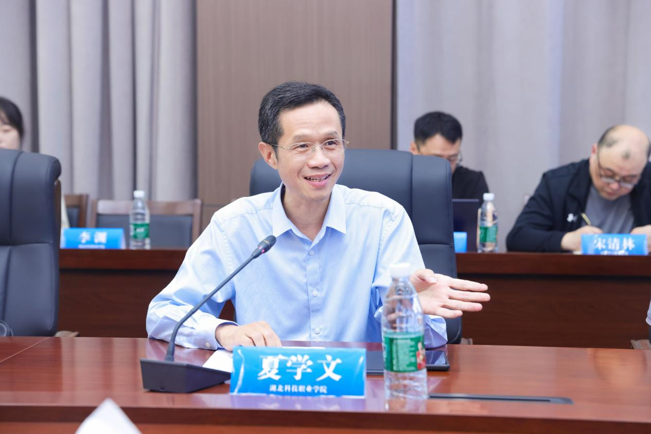 夏學文簡要介紹了學校作為湖北省“雙高計劃”建設院校在人工智能教育領域的積極探索與取得的成果。他指出學校通過牽頭成立湖北省人工智能行業產教融合共同體、建設省級《人工智能技術應用》通識課程等舉措構建了產教融合發展新格局。目前學校正與廣東科學技術職業學院、湖南科技職業學院等兄弟院校共同牽頭立項建設國家級人工智能教學資源庫,已明確了資源庫系統建設、智能化應用升級及國際化戰略推廣三大核心任務。