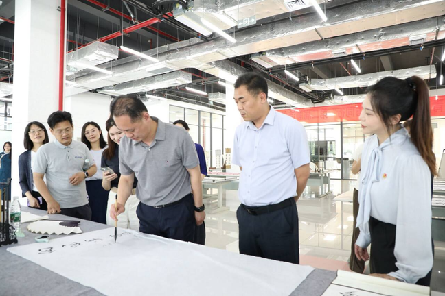 王雨寒與師生代表觀看并參與了豐富多彩的社團(tuán)活動(dòng),一起體驗(yàn)漆扇制作、品嘗茶酒社特調(diào)的夏日飲品、觀看滑輪社的技巧動(dòng)作、欣賞大學(xué)生藝術(shù)團(tuán)模特隊(duì)的“運(yùn)動(dòng)show”等。丁華濤在“青廉畫(huà)·清廉與青春同行”第二屆廉潔書(shū)畫(huà)展活動(dòng)現(xiàn)場(chǎng)為同學(xué)們題字《向冠軍學(xué)習(xí)》。在互動(dòng)環(huán)節(jié),王雨寒向同學(xué)們展示了自己日常健身的小妙招、分享了自己奪冠的心路歷程,給同學(xué)們傳遞了勇于奮斗、不畏挫折的精神力量。