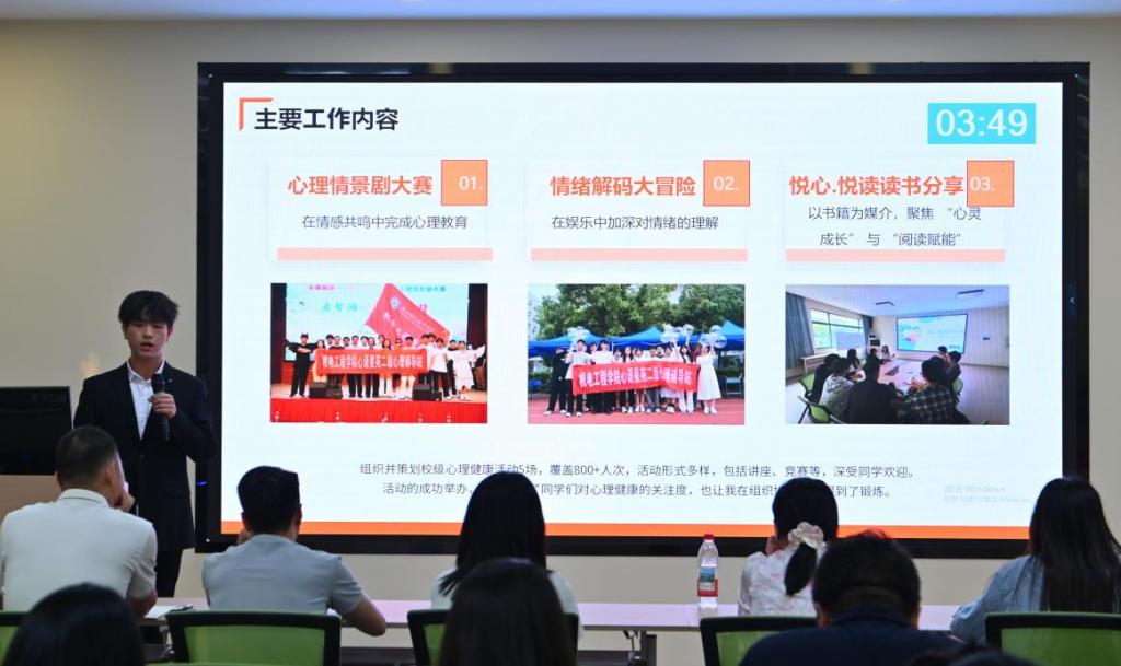 3月至5月,學工部開展心理情景劇編創、心理委員專項培訓,各學院通過素質拓展、心理觀影等活動提升隊伍能力。5月25日,機電工程學院承辦“關愛心靈 共筑未來”心理委員PPT大賽,12名選手圍繞“履職實踐、案例干預、未來規劃”分享經驗,以數據化成果、可視化案例聚焦工作實際,展現了心理委員在“宿舍—班級—學院—學校”四級預警體系中“前沿哨兵”的作用。