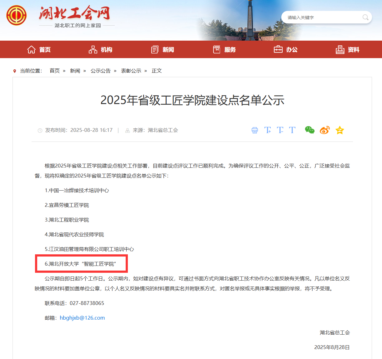 本網(wǎng)訊(通訊員 陳霞 文/圖 )近日,從省總工會(huì)傳來好消息,湖北開放大學(xué)“智能工匠學(xué)院”成功獲批2025年省級工匠學(xué)院建設(shè)點(diǎn)。這一榮譽(yù)的獲得,不僅是對學(xué)校多年來在職業(yè)教育領(lǐng)域深耕細(xì)作的高度肯定,更為學(xué)校培養(yǎng)高技能人才打造了一個(gè)重要的嶄新平臺。