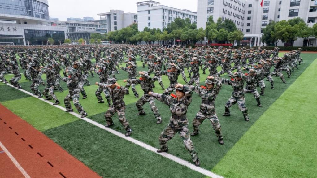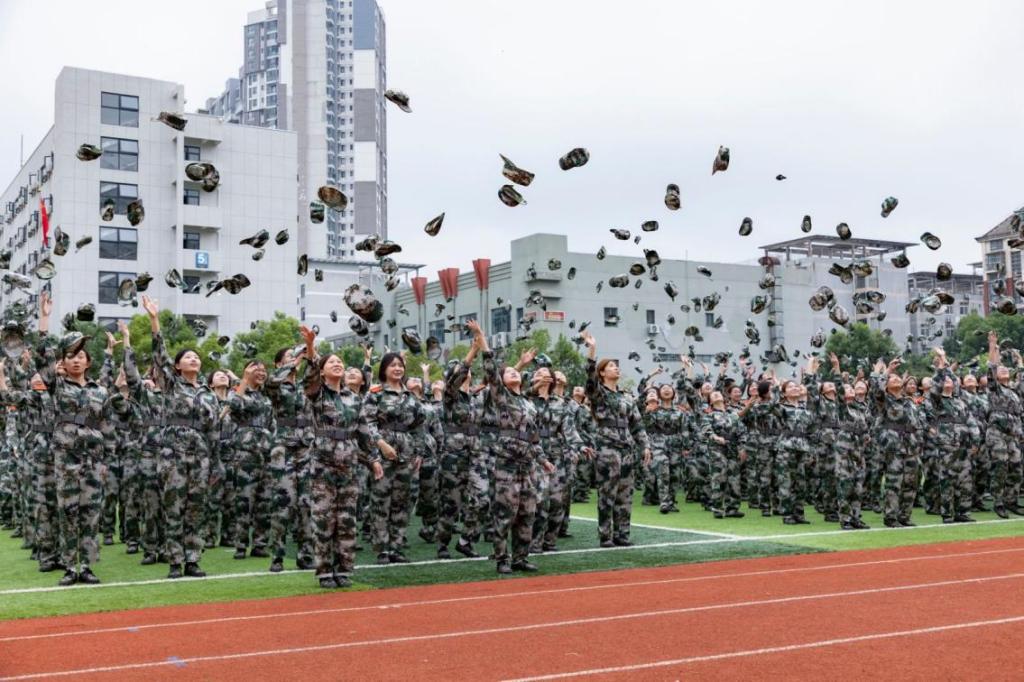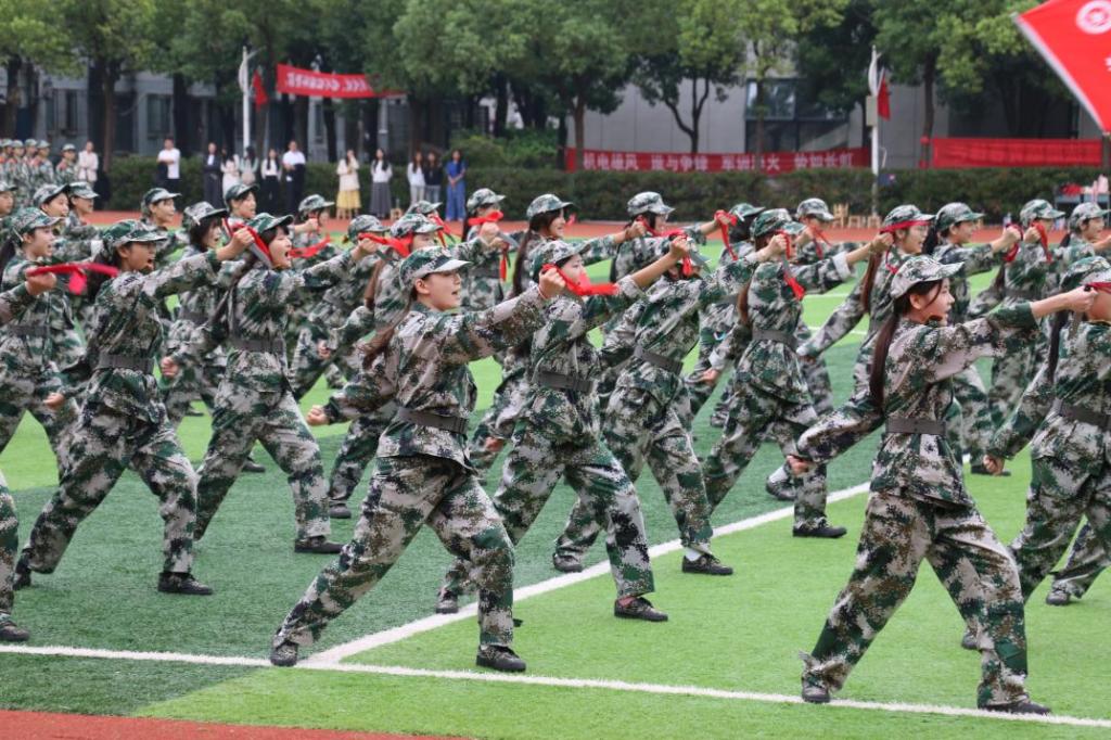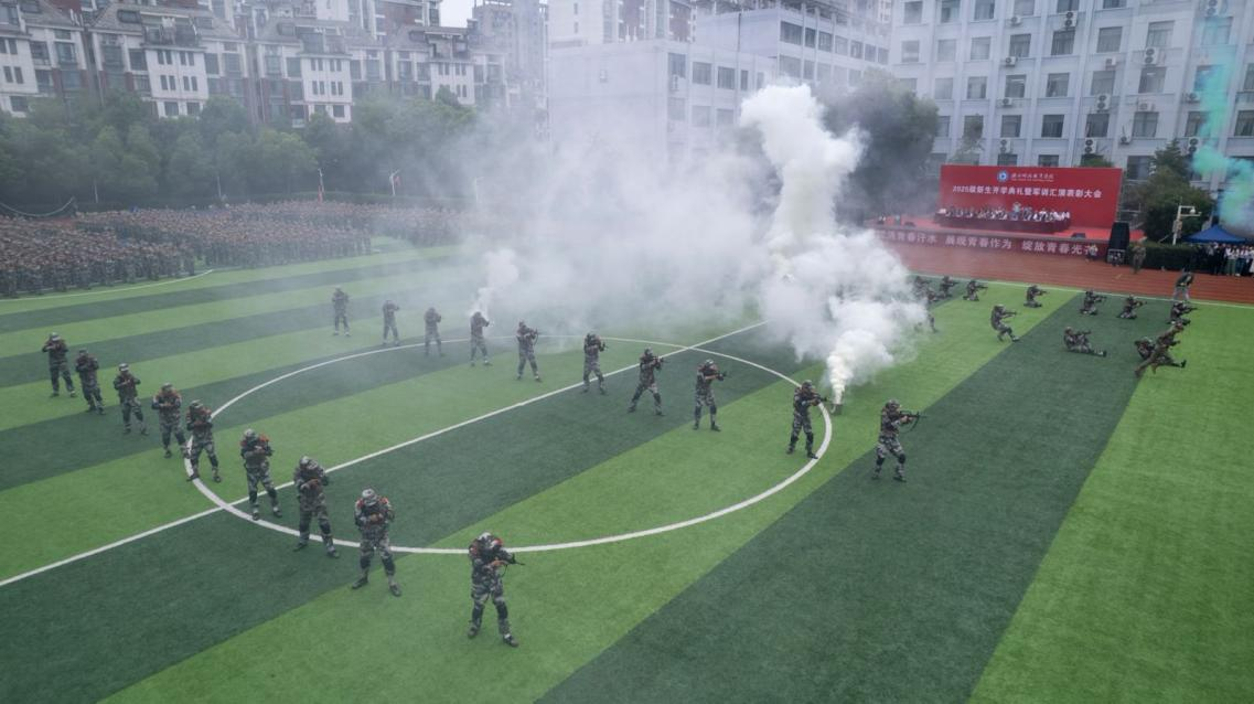 隨后,軍訓匯演正式開始。在激昂的旋律中,特色方陣依次登場,以飽滿的精神狀態展現14天軍訓的豐碩成果。匕首操方陣動作剛勁有力,寒光閃爍間盡顯巾幗風采。她們手持短刃,一招一式剛柔并濟,展現出別樣的颯爽英姿。擒敵拳方陣步伐沉穩鏗鏘,拳影翻飛間盡顯青春擔當。他們足踏實地,一拳一腿剛猛凌厲,展現出熱血的昂揚姿態。“戰術對抗”表演更是將現場氣氛推向高潮,新生們模擬實戰場景,臥倒、匍匐、沖鋒,每一個動作都精準到位,充分展現了頑強的意志品質和過硬的紀律作風。