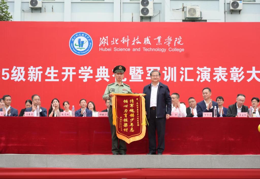 校黨委書記鐘毓寧代表學校向承訓單位贈送錦旗,感謝承訓單位對學校軍訓工作的大力支持和辛勤付出。