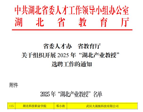 本網訊(通訊員 王婷 李淵 文/圖)近日,中共湖北省委人才工作領導小組辦公室、湖北省教育廳公布2025年“湖北產業教授”名單,由我校推薦的武漢大晟極科技有限公司董事長兼總經理鄧小濤博士成功入選“湖北產業教授”。截至目前,我校“湖北產業教授”增至3人。