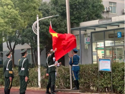 上午7點整,足球場前莊嚴肅穆,伴隨著激昂雄壯的《義勇軍進行曲》,鮮艷的五星紅旗冉冉升起,全校師生面向國旗共同迎接新學期的到來。