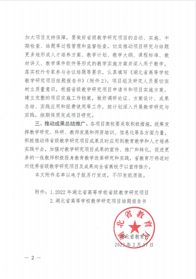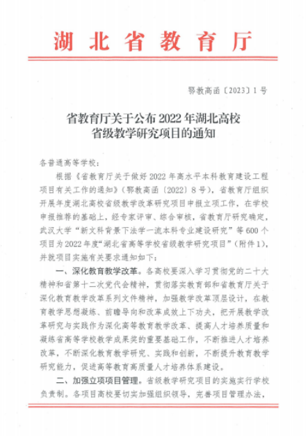 本網訊(通訊員 詹樂 文/圖)2月11日,省教育廳公布了2022年度湖北省教學研究項目名單,我校推薦申報的2022年湖北高校省級教學研究項目獲批立項2項:機電工程學院教師付強《高職石油工程專業課程思政教學實踐與創新路徑研究》、工商管理學院教師李智《“鄉村振興”背景下湖北高職院校專業結構優化調整的路徑與策略》。