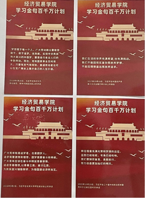 本網(wǎng)訊(通訊員 李哲/文 楊斌凱 劉禎舜/圖)習(xí)近平總書(shū)記指出:“學(xué)習(xí)理論最有效的辦法是讀原著、學(xué)原文、悟原理,強(qiáng)讀強(qiáng)記,常學(xué)常新”。為深入學(xué)習(xí)貫徹習(xí)近平新時(shí)代中國(guó)特色社會(huì)主義思想,以思想引領(lǐng)助力學(xué)生成長(zhǎng)成才,本學(xué)期經(jīng)濟(jì)貿(mào)易學(xué)院?jiǎn)?dòng)了“學(xué)習(xí)金句百千萬(wàn)計(jì)劃”。