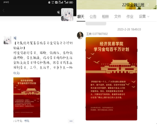學(xué)院還將金句卡片推送至班級(jí)群,很多學(xué)生在學(xué)習(xí)以后紛紛發(fā)布微信朋友圈,進(jìn)一步擴(kuò)大了金句學(xué)習(xí)的影響和范圍。