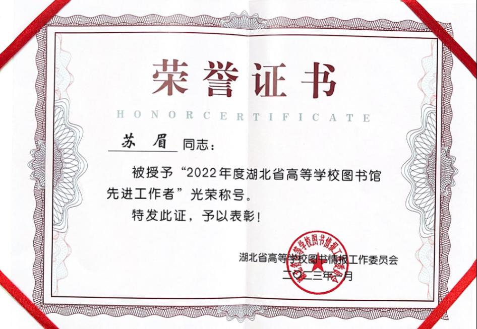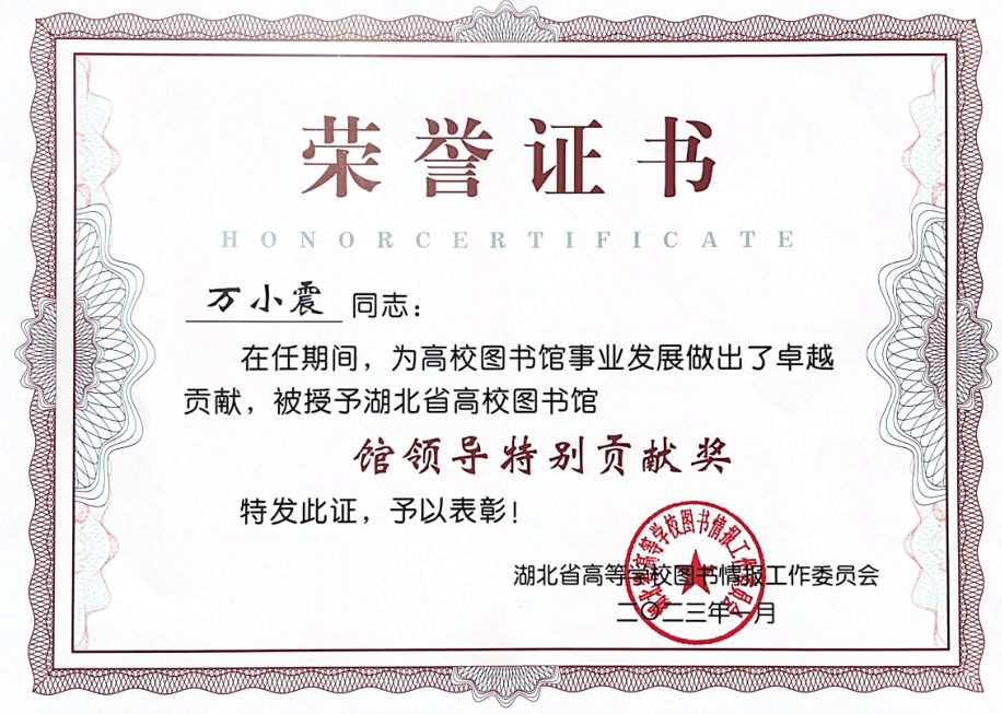 本網訊(通訊員 蘇眉 文/圖)近日,湖北省高等學校圖書情報工作委員會在湖北咸寧組織召開“2023年湖北省高校圖書館館長工作研討會”。會議期間對獲獎圖書館進行了表彰,我校圖書信息中心主任萬小震榮獲 “館領導特別貢獻獎”,館員蘇眉榮獲“2022年度湖北省高等學校圖書館先進工作者”光榮稱號。