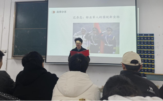 2024級金融專業王澤同學以退役士兵遲忠存的成長故事為例,講述其從“軍營尖兵”到“稅務尖兵”的蛻變歷程。遲忠存憑借部隊錘煉的堅韌品格,在稅務系統快速成長為業務骨干,其“橄欖綠到稅務藍”的經歷引發在場學生的熱烈討論。