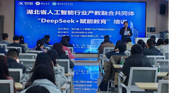 本網(wǎng)訊(通訊員 李春風(fēng) 文/圖)3月19日,湖北省人工智能行業(yè)產(chǎn)教融合共同體主辦的“DeepSeek+賦能教育”專題培訓(xùn)在我校綜合實(shí)訓(xùn)樓舉行,副校長夏學(xué)文教授參會(huì)并致辭,湖北大學(xué)人工智能學(xué)院副院長曾誠教授、科大訊飛智能硬件實(shí)驗(yàn)室總監(jiān)李奎、虛擬仿真實(shí)驗(yàn)室總監(jiān)夏明峰、我校人工智能技術(shù)應(yīng)用專業(yè)負(fù)責(zé)人伍輝教授依次報(bào)告,共同體成員單位70余名教師參加培訓(xùn)。會(huì)議由人工智能學(xué)院院長涂家海主持。