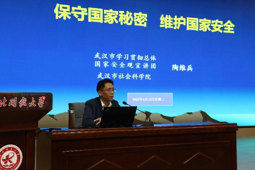 4月15日,學校開展“國家安全知識進校園”主題教育活動,邀請武漢市學習貫徹總體國家安全觀宣講團成員、武漢市社科院文化與歷史研究所陶維兵所長到校開展專題講座。講座中,陶維兵結合詳實的數據與真實案例,系統闡釋總體國家安全觀的核心內涵,深入剖析當前我國面臨的安全風險類型,并就如何應對新挑戰、新威脅,引導師生思考維護國家安全的責任與行動。與此同時,學校同步啟動“共筑保密防線,師生人人有責”主題保密宣傳教育月活動。通過播放保密公益宣傳片、張貼宣傳海報等方式,全方位營造濃厚的保密宣傳氛圍;組織開展形式多樣的理論學習活動,引導師生深入學習保密法律法規與紀律要求,推動保密宣傳教育走深走實、入腦入心。