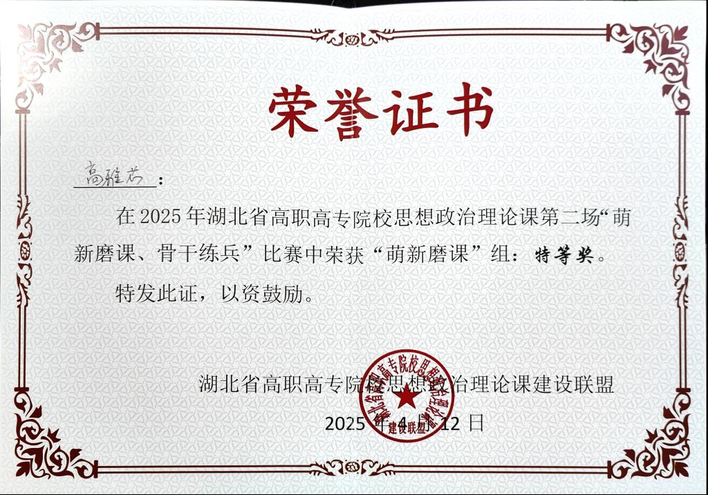 高雅芯參加的“思想道德與法治”課程“萌新磨課”組教學(xué)展示,在全省33個(gè)作品中脫穎而出并進(jìn)入現(xiàn)場賽決賽。備賽期間,她先后制作了多份創(chuàng)新教案和創(chuàng)新課件,一次次練習(xí)和打磨作品。4月11日,現(xiàn)場賽在武漢職業(yè)技術(shù)大學(xué)舉辦,采取隨機(jī)抽題、限時(shí)準(zhǔn)備、計(jì)時(shí)講授的方式進(jìn)行。高雅芯與其他10所進(jìn)入現(xiàn)場賽的高職院校思政教師同臺競技,最終憑借出彩表現(xiàn)取得第二名的好成績,榮獲“萌新磨課”組特等獎(jiǎng)。