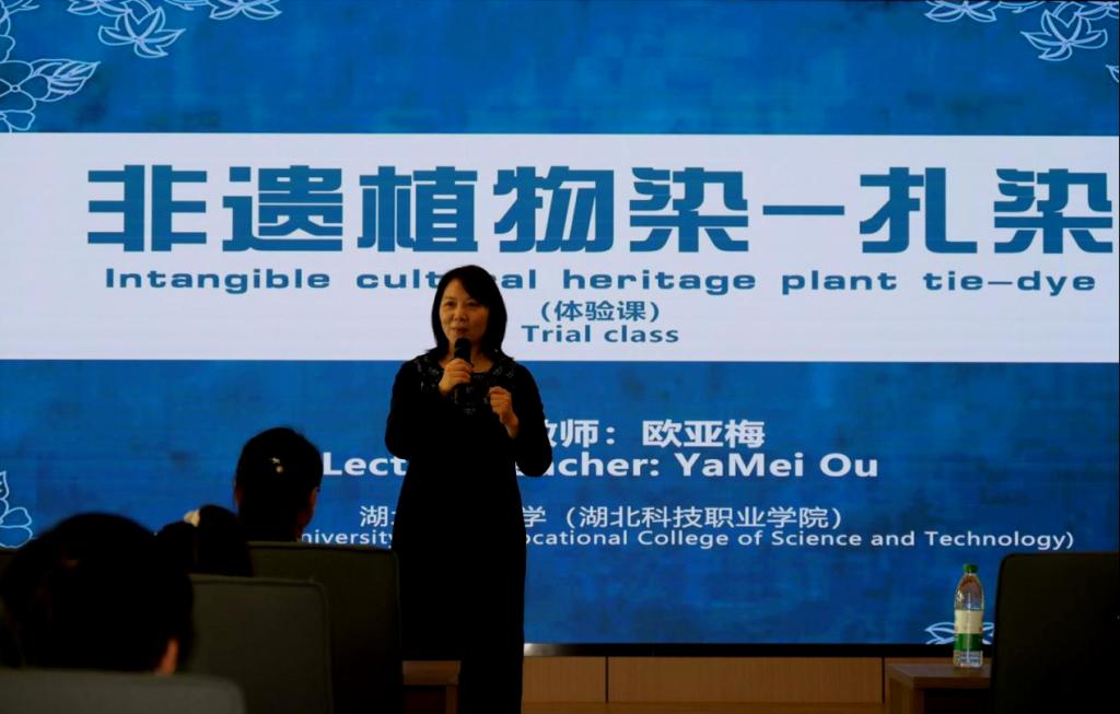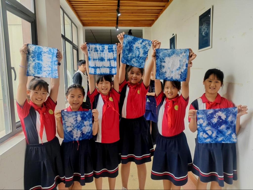 我校非遺項目負責人歐亞梅老師以“非遺植物染——扎染”為題,生動介紹了傳統植物藍染文化與扎染技藝流程。課程實踐環節,學生志愿者分組指導大花嶺小學師生完成藍染項目化課程。當靛藍色在織物上暈染出獨特圖案時,傳統工藝在校校傳遞中煥發新生。