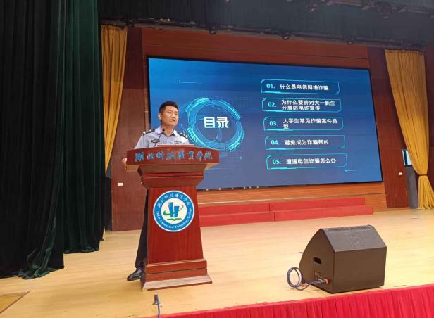 武漢市公安局東湖高新分局劉曉琦警官結合自身辦案經驗,對高校大學生常見的電詐案件類型、作案手法進行了詳細講解。他借助高校發生的真實案例向同學們普及“兩卡”犯罪的相關知識,告誡同學們,出租、出借、出售“電話卡、銀行卡”兩卡是違法行為,不僅會給個人帶來嚴重的法律風險,還會助長電信網絡詐騙等違法犯罪活動的蔓延。