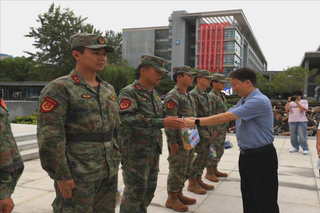 隨后,學院領導班子成員們紛紛走入連隊方陣,將一份份印刻著“我?軟件”的慰問品送到教官和同學們手中,并與同學們親切交流,詢問訓練強度、身體狀況和適應情況,叮囑大家科學訓練、注意休息、及時補水,以最佳狀態迎接挑戰。