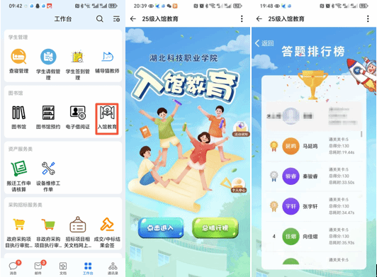 為覆蓋全體2025級新生,同步推出線上“云入館”教育活動。新生通過企業微信微應用進入圖書館專欄“入館教育”模塊,完成“知識點學習+闖關答題”兩大環節:知識點學習板塊系統梳理圖書館規則、資源檢索、設備使用等核心內容,幫助新生利用碎片化時間掌握關鍵信息;闖關答題則以趣味題型檢驗學習成果,加深記憶。