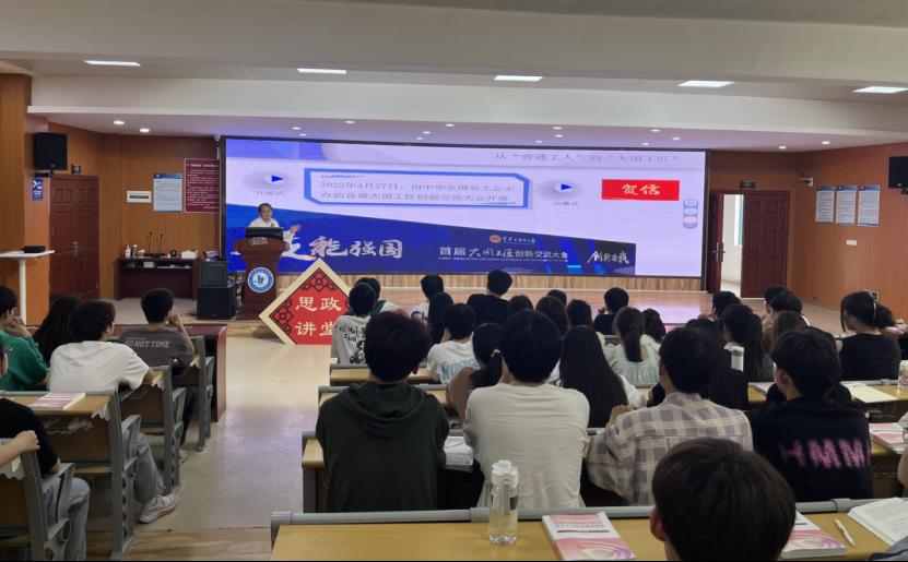 講課以立足科技前沿,貼近學生專業的形式開場。結合青年學生們所學的物流管理專業,鐘毓寧帶領大家了解目前行業內解決“最后一公里”配送問題的新發明,觀看了無人送物機器人、倉儲機器人的精彩視頻短片,并以我國召開的首屆大國工匠創新交流大會為切入點,幫助同學們樹立技能強國理念,理解勞模精神、勞動精神和工匠精神的深刻內涵和緊密關系。
