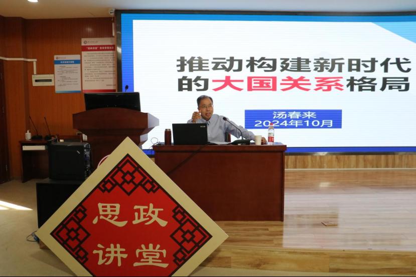 湯春來以“推動構建新時代的大國關系格局”為主題,用生動鮮活的語言,豐富的案例,并結合時事和數據,以中外對比等方式,深入淺出地從世界變局、國際對局、大國格局和中國開局等四個方面來進行講解。當今世界正進入新的動蕩變革期。百年大變局加速演進,烏克蘭危機久拖不決,巴以沖突再起,世界經濟增長動能不足,各種潛在風險挑戰著世界的穩定與秩序,損害著人類安全、和平和繁榮的前景。面對動蕩變革的世界,大國要如何應對?負責任的大國應該是什么樣的?中國又是如何構建大國關系格局的?湯春來號召師生們既要有家國情懷,又要有國際視野,要好好學習專業技能,發揮自己的專業特長,為推進構建新時代的大國關系格局貢獻自己的力量。