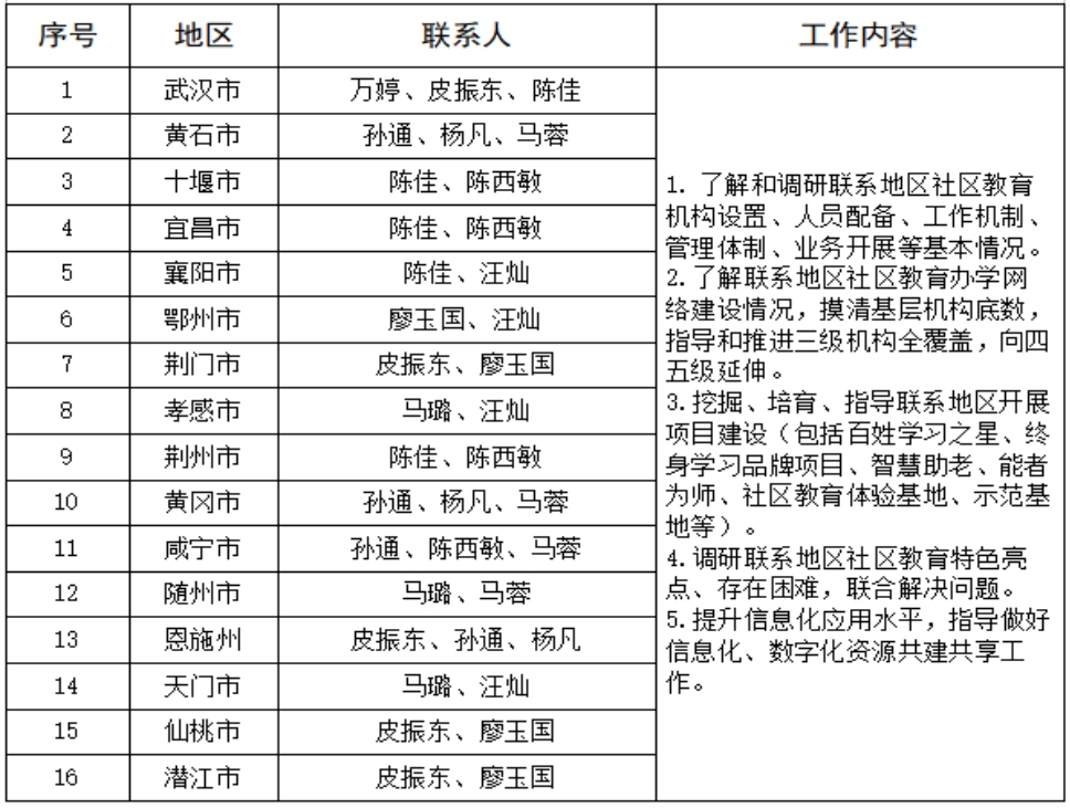 科學謀劃下好“先手棋”。在《通知》基礎上,學院明細了《湖北省社區教育指導中心指導服務安排表》與《指導服務記載表》,要求全院全員全覆蓋對口服務省內各市(州)社區指導中心以及轄區內基層社區教育教學點,強調密切聯系基層、提高履職本領、強化責任擔當,以月為單位推進工作,定期公示指導進展,以成效為導向考核工作績效。