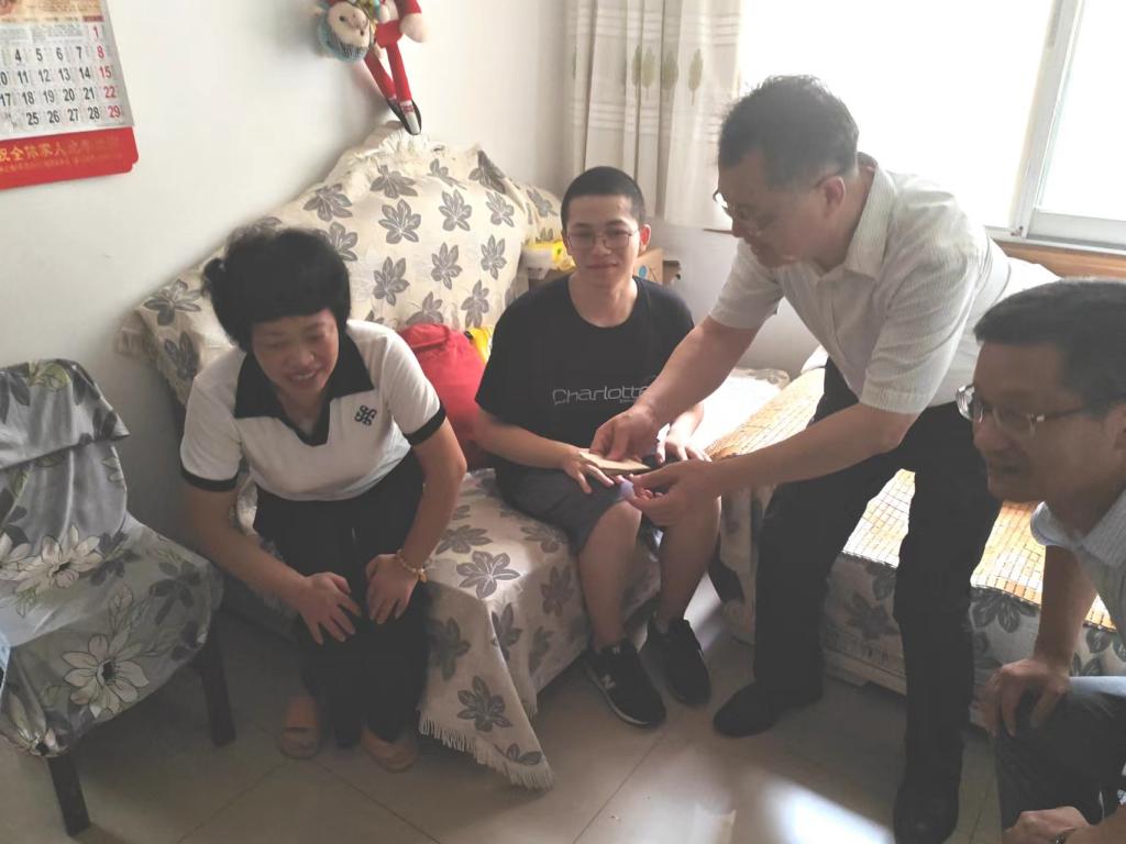 25日上午,驕陽似火,劉義一行抵達劉子銀同學家庭所在地江夏老城區龍頭街道時,劉子銀便早早等待在路邊。穿過狹長的巷子,一行人在劉子銀的帶領下登上了老舊的樓梯,到達六樓家中。劉子銀母親熱情迎接,激動不已,“一周前聽孩子說學校領導老師要來我們家,今天見到真人還是不敢相信”。