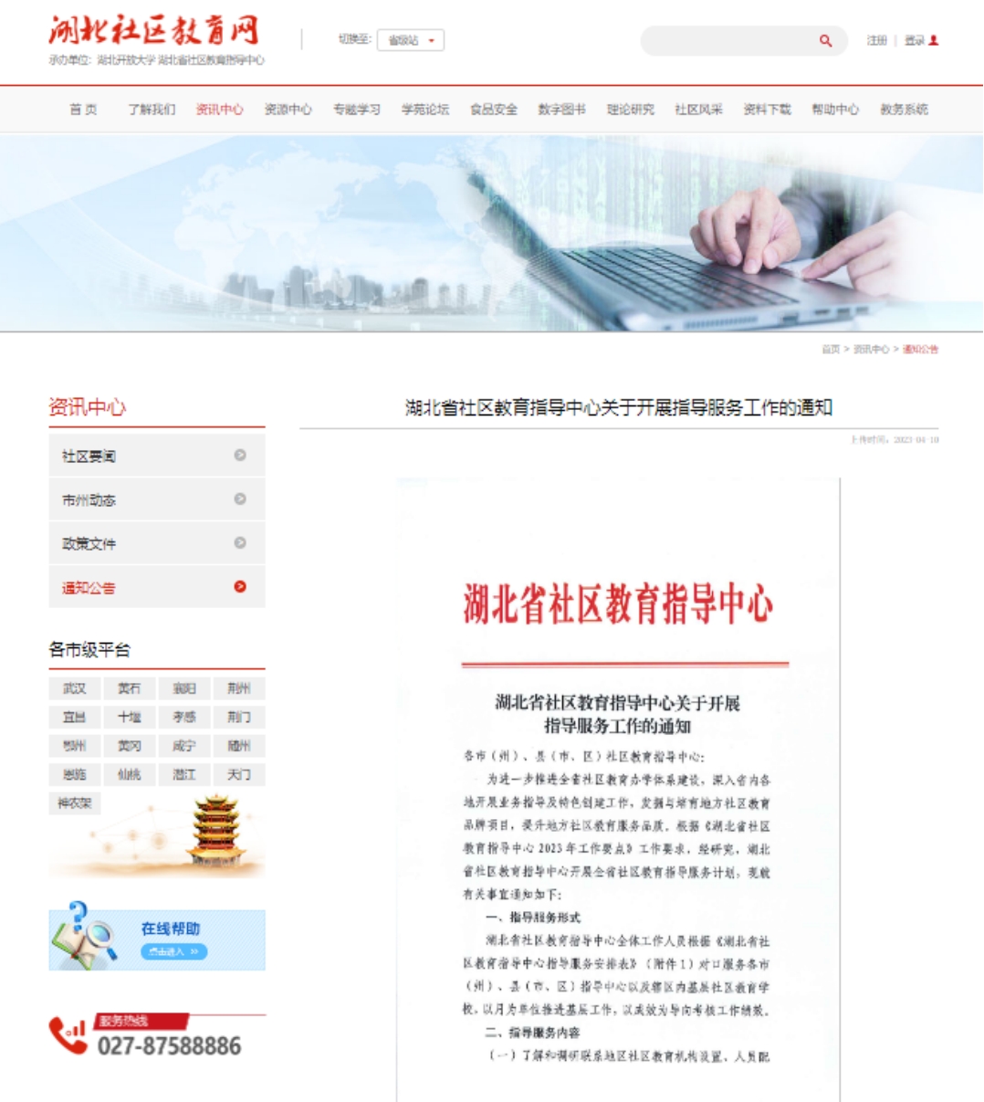 《湖北省社區教育指導中心關于開展指導服務工作的通知》截圖
